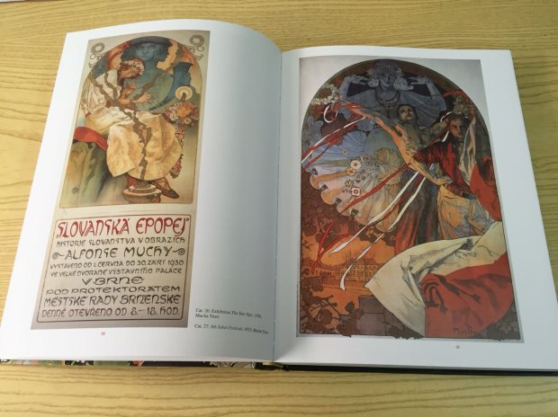 Cuốn sách cũng có các tác phẩm của ông trên vải, bao gồm phấn màu và các bức bích họa, và tác phẩm Magnum opus của ông, Bản sử thi Slav, một loạt 20 bức tranh mô tả lịch sử của người dân quê hương ông.