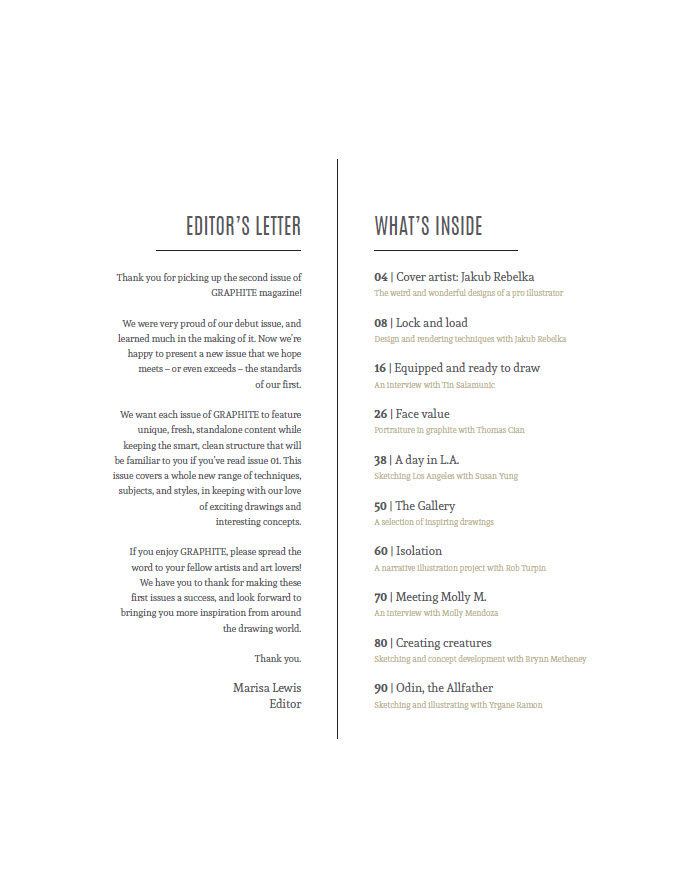 GRAPHITE là ấn phẩm hàng quý giới thiệu các tác phẩm nghệ thuật đầy cảm hứng, các cuộc phỏng vấn và hướng dẫn về vẽ, phác thảo và minh họa.